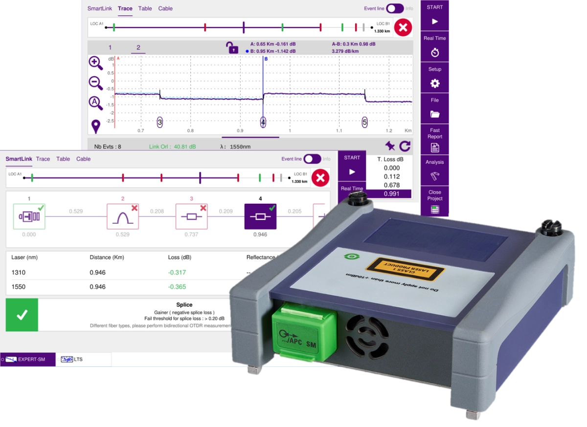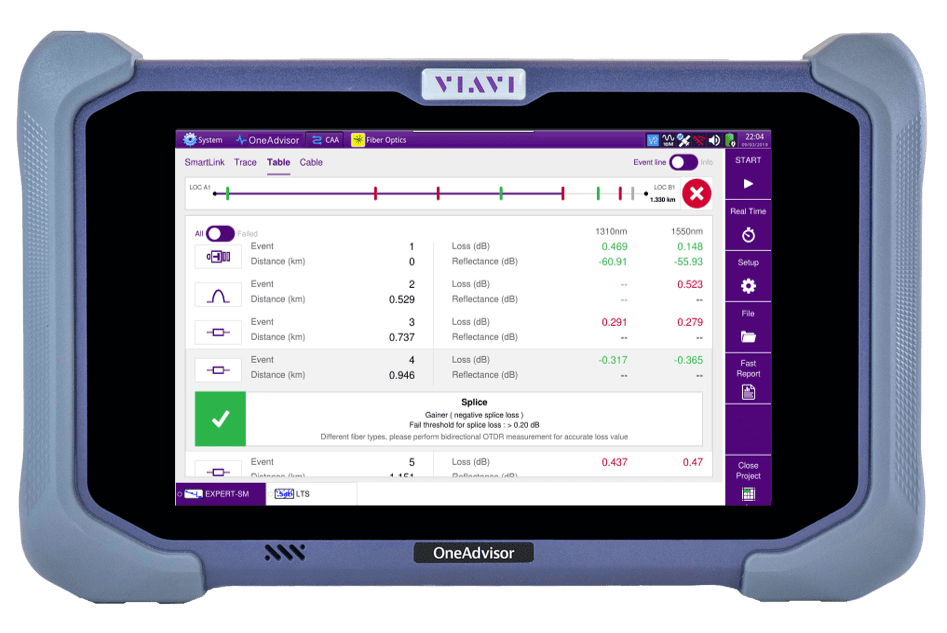 The VIAVI One Advisor 800 comes equipped with the long range OTDR module which supports all three single mode wavelengths of 1310, 1550 and 1625nm. The range on this module extends to 45dB on 1550nm with a distance display range of up to 400 Km.